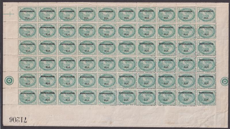Tonga 1894 2½d on 1/- King George I deep green, p12½, RH pane (sheet #71206) of 60, with the following identified varieties: #13 (broken "E" of "SURCHARGE"; #32 (part stop after "SURCHARGE"), #33 (no stop after "SURCHARGE"); #37 (small raised stop); #38 (part stop after "SURCHARGE"); #39 not stop after "SURCHARGE") & #42 (short fraction bar). Most with tissue interleaving & one of only 300 panes thus surcharged. Remarkable item. Cat £1320 as normals.