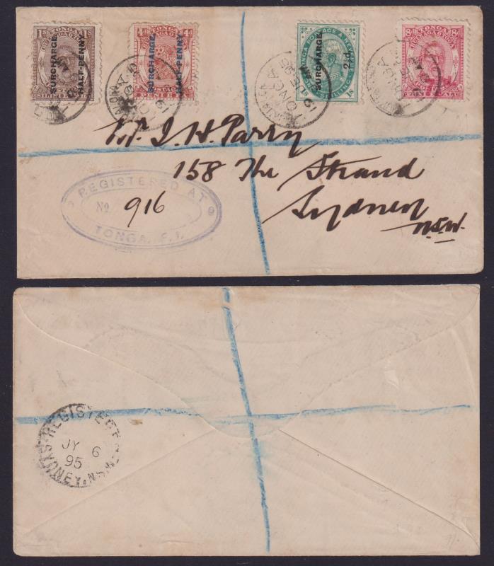 Tonga 1895 triple weight registered cover to Sydney bearing 8d King George I bright mauve, ½d on 4d, ½d on 1/- & 2½d on 1/- with purple oval REGISTERED AT / TONGA. F.I. r/s & 916 inserted in black m/s, cancelled Nukualofa 19 June with 6 July arrival b/s. SG 13, 21, 22 & 24. [8d on cover cat from £1,800.]