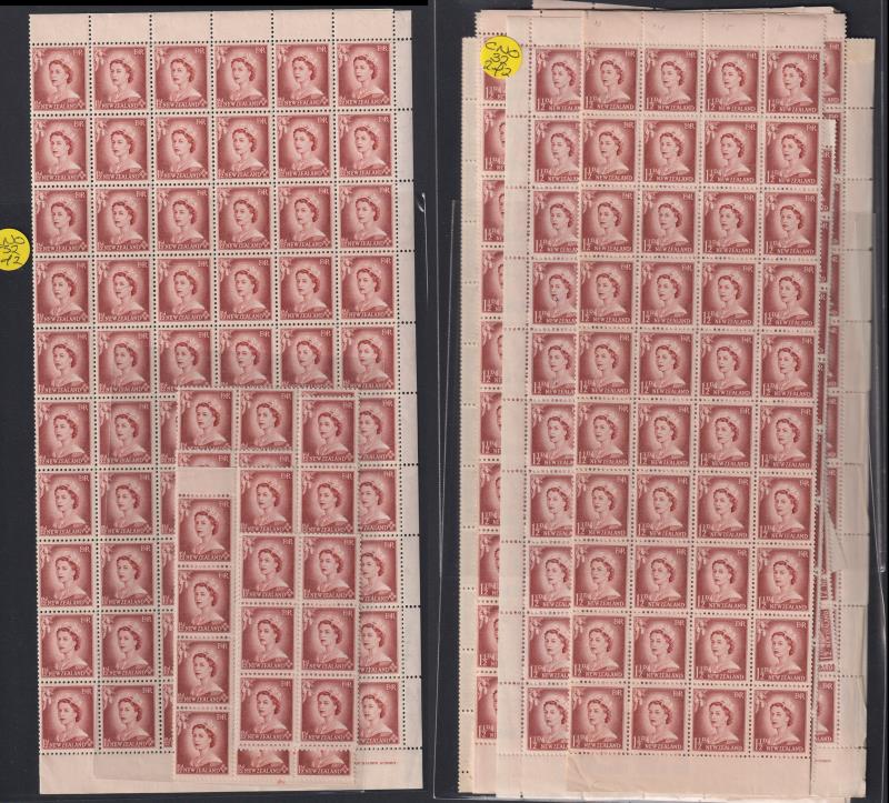 1953 1½d QEII lake-brown (original issue) x 170 in blocks, incl block of 120. Also 1955 QEII 1½d lake-brown, large figures of value x 840 in large blocks, incl some plate blocks. Fine. Jury cat $3115. MUH.
