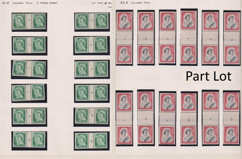 c1954-5 2d, 3d, 4d, 6d, 8d (all small figures), 9d & 1/- QEII coil pairs sets of 19. CP cat approx $1850. MUH.