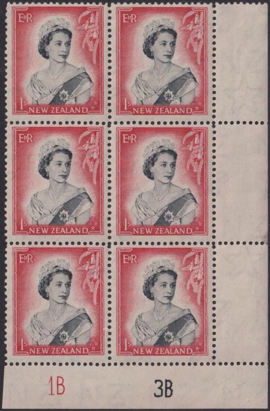 1958 1/- QEII vertical plate block of 6 - no IB 3B, ie centre Die IB. CP N10b. Cat approx $4000. Top pair LH mint (ie: PB of 4 MUH).