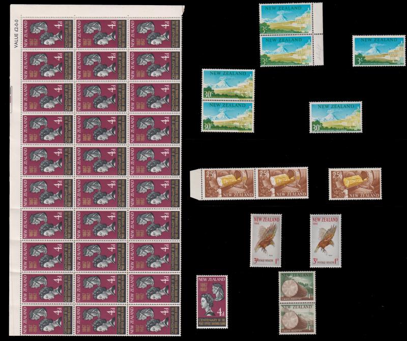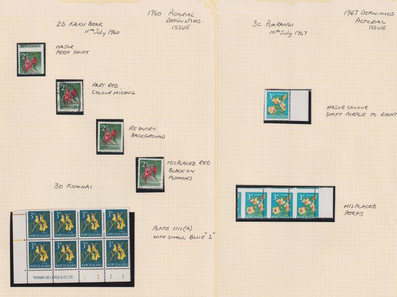 1960 Pictorials: 2d misperfed single resulting in "NEW ZEALAND" appearing at top of stamp MUH + 3 minor varieties; 3d plate 1111 block with small blue digit 1 mint/MUH; 1967 3c right selvedge single with purple colour misplaced 2 mm to right, & also right selvedge horiz strip of 3 misperfed, MUH.