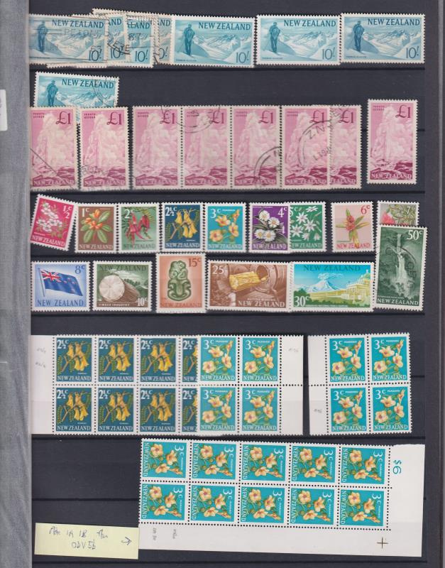 1960-6 Pictorials seln of 166 mint & used on s/b pages. Incl 2½d Titoki invtd wmk FU x 2, 3/- multicolour invtd wmk MUH & FU, £1 Geyser MUH & FU x 7. Also incl 40 MUH 1967 Pictorials incl 2½c & 3c plate varieties (CP ODV4d, ODV5b, ODV5e & ODV5f). CP cat $1800.