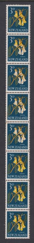 1960 3d Kowhai vert strip of 8 showing progressive missing yellow (affecting leaves); 1 partial (about 2/3rds omitted), 3 complete omitted & 4 normals. CP O5a/z. Cat $1275+. MUH (2 minor tone spots).