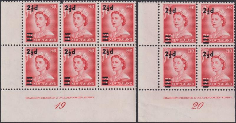1961 2½d on 3d QEII plate block of 6 (No 19), plate block of 4 (No 20). 5½mm wide setting (pl 19 1 short corner). CP N42b. Cat $5000 as bB of 6s. LH mint.