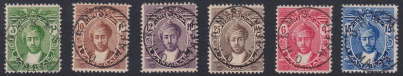 Mafia Island c1915 O.H.B.M.S. (On His Britannic Majesty’s Service) h/s applied in black on Zanzibar 3c, 10c, 12c, 25c (multiple rosettes wmk), 6c & 15c (multiple crown CA wmk) Sultan Khalifa bin Harub, mint. Unlisted by SG, Scott etc. Each has small MSC expertiser’s/owner’s mark on rear. Note: a similar (75c) stamp, described as being rare, was sold for €220 in a German auction in March 2023.