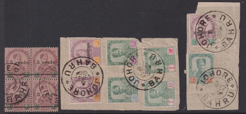 Malaya-Johore 1891-1896 x 2 pieces: a) 2c SG 22, SG 33 & SG 40, 3c SG 41, 25c SG 47 & 50c SG 48; b) 5c SG 36 & SG 44. Both with 2 fine strikes of circular “JOHORE / crown / BAHRU” cancels. Also, 3c on 4c (SG 28) block of 4 FU, with two fine half strikes of “JOHORE / star & crescent / BAHRU” cancel. Note: these cancels are mentioned by Robson Lowe in Stamps of the British Empire Vol III, 1951, & both are unpriced.