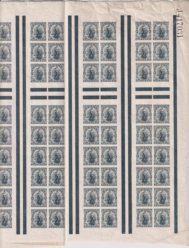 1919 1d Dominion imperf proof sheet (J417031) of 24 booklet panes in black, folded, & with vertical row of perforations (p14) running through NEW ZEALAND letters wmk at left. Some selvedge damage affects sheet number & 1 stamp of booklet pane R1/8. Ideal for plating as annotated “All 144 impressions have some / minor flaw & can be plated”. Rarely offered. MUH.