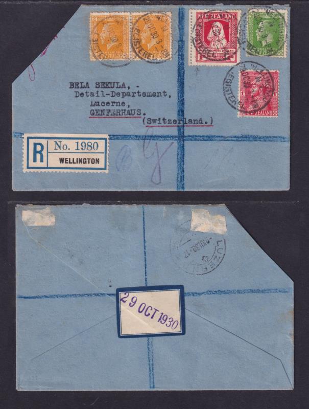 1930 reg'd cover to Switzerland (corner clipped off), typed address (to stamp dealer Bela Sekula). Franked 1930 1d + 1d Health (corner tear), ½d, 1d & 2 x 2d GV, canc 5 strikes of Wellington / Registered cds 29 OC 30 (1st day of Health stamp). Health FDC cat $850.